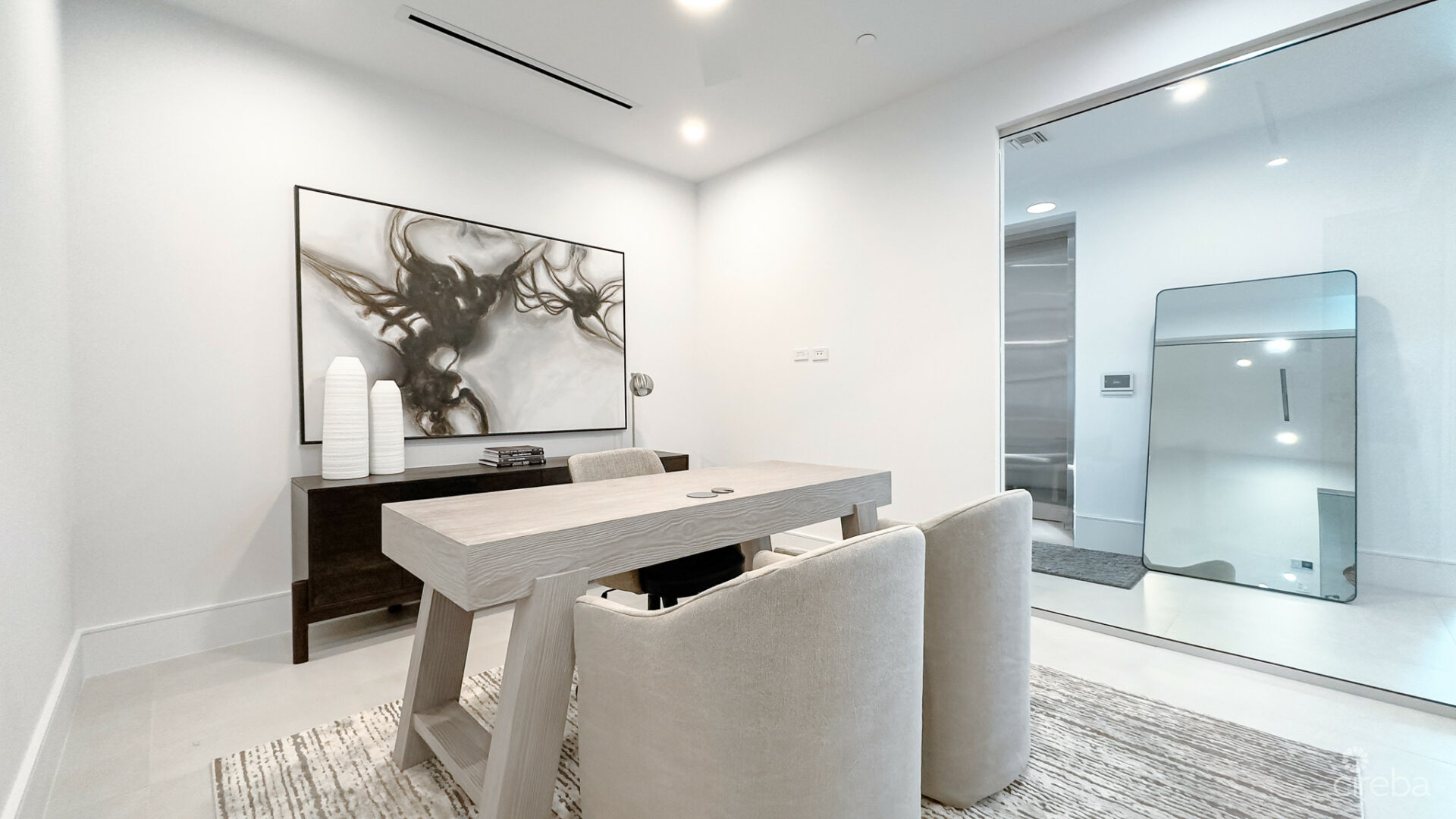 Inside, the contemporary design and expansive living areas are flooded with natural light, thanks to floor-to-ceiling windows in nearly every room. The residence is finished to the highest standards, featuring custom cabinetry, a gourmet kitchen equipped with Miele and Sub-Zero appliances, Caesarstone quartz countertops, and rich natural stone and timber accents. Additional highlights include a spacious terrace on the sunrise side, accessible from two of the back bedrooms, as well as separate laundry and storage areas, a private office, and an elevator that opens directly into the residence.