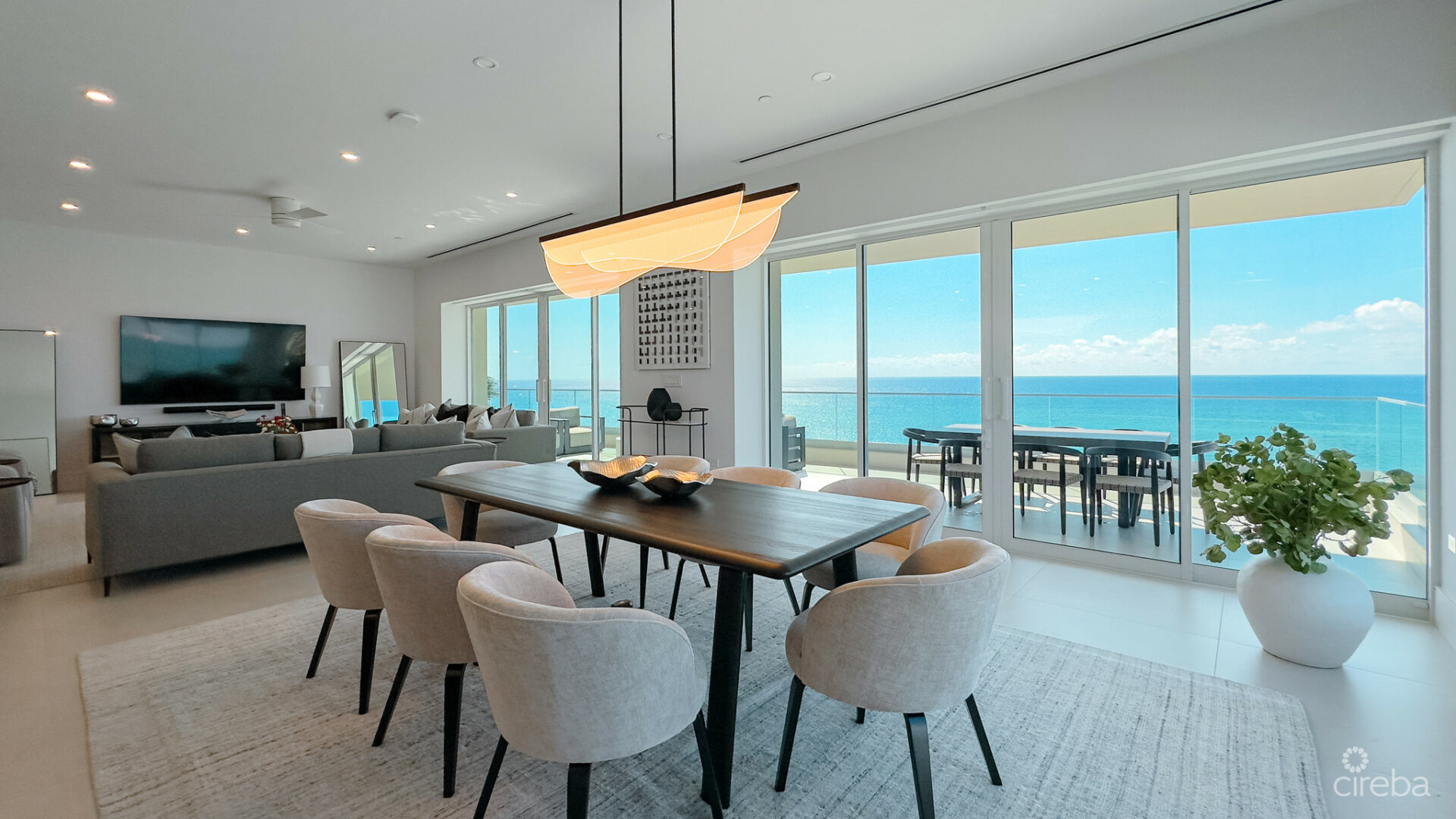Occupying the entire 7th floor, with 360-degree panoramic views, this residence boasts an impressive 50-foot-wide beachfront terrace, offering ample space for entertaining and dining while enjoying the breathtaking views of Seven Mile Beach and its stunning sunsets.