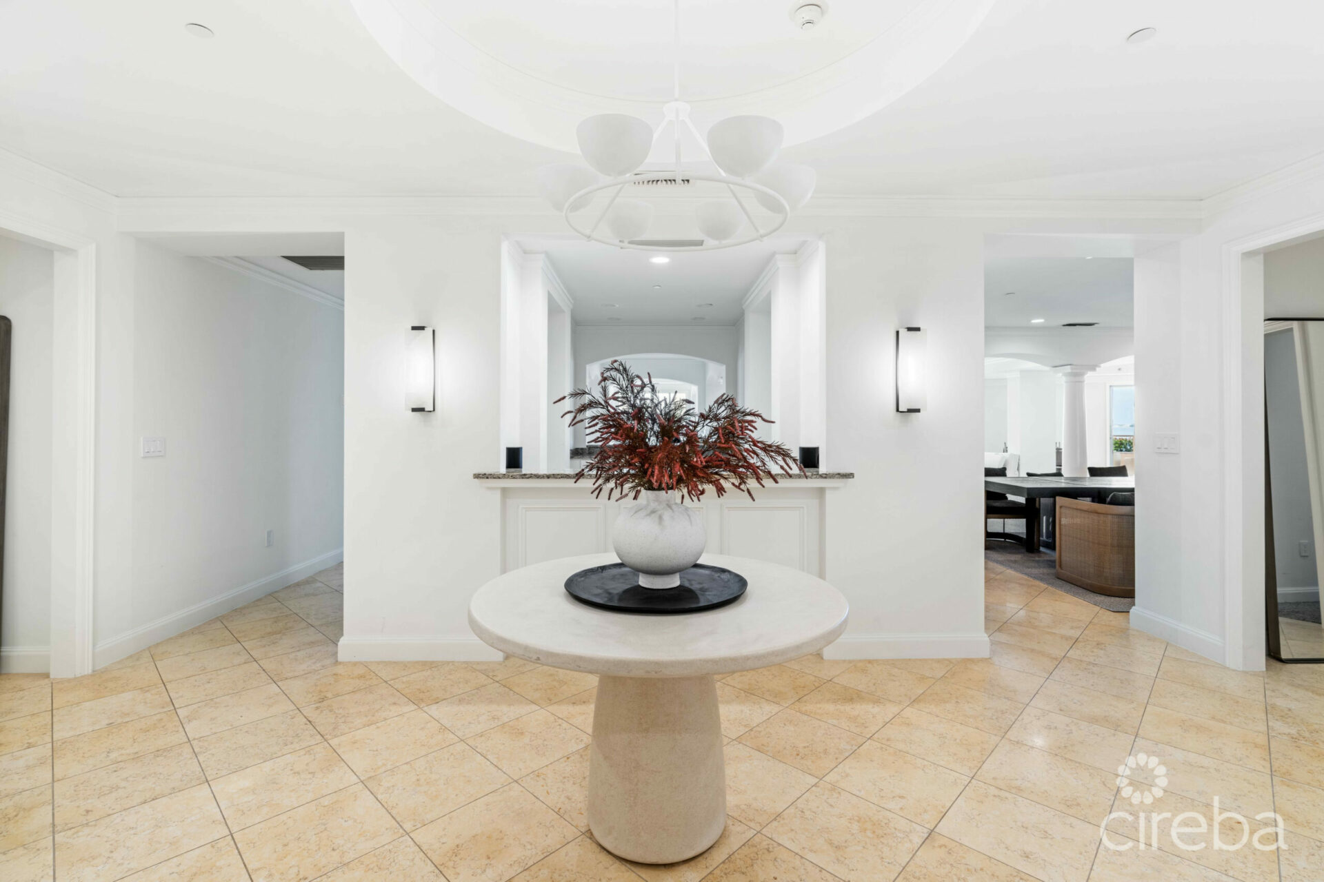 A large foyer sits at the entrance to this grand residence, leading to an open-plan living area and terrace with breathtaking views of the turquoise waters, perfect for relaxing and entertaining. Two large master suites on either side of the residence boast a private terrace with ocean views and generous spa-like bathroom with tub and shower. Two additional suites have a private balcony and en suite, and a further two bedrooms have an adjacent bathroom.