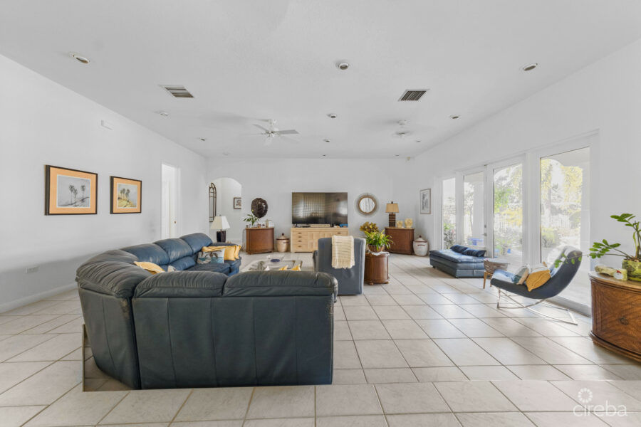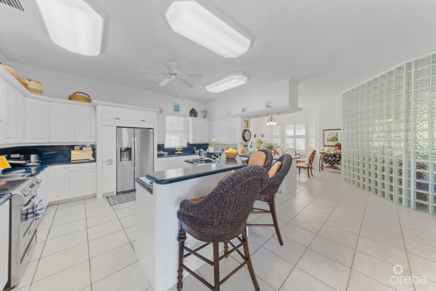 Water enthusiasts will appreciate the dual boat docks, including one area with a bbq and welcoming, breezy cabana. Two stunning swimming pools and a waterfall jacuzzi are an added luxury. The expansive canal ensures easy access to the North Sound, making this property a boater’s dream.