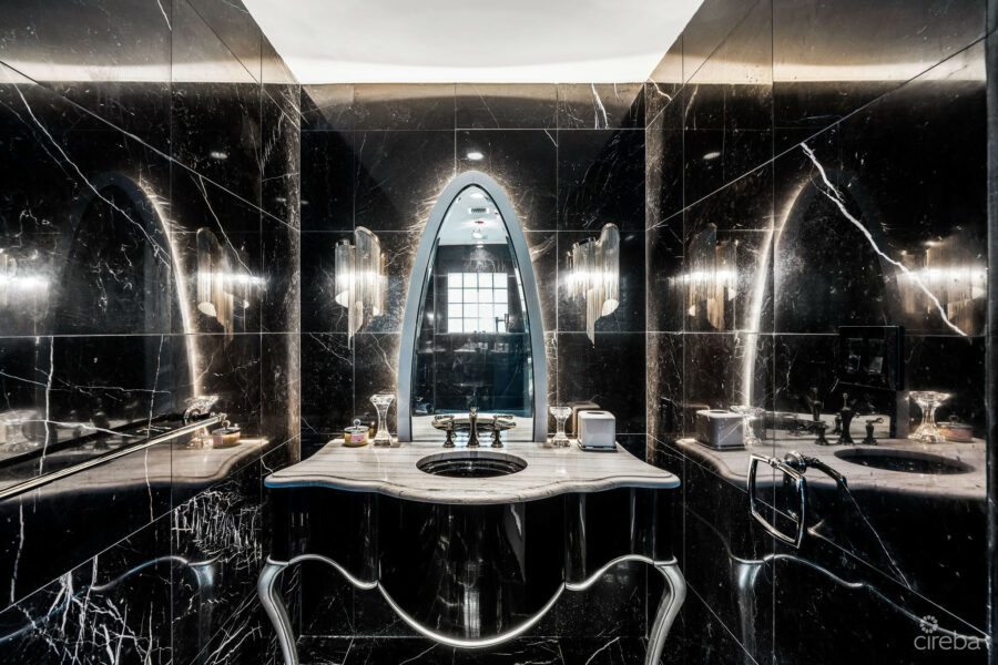 Step outside to a 50-foot resort-style pool, an expansive outdoor deck and outdoor BBQ station—ideal for alfresco dining and entertaining while enjoying the stunning ocean breeze and ethereal glowing sunrises and sunsets. The meticulously designed and completely renovated chef’s kitchen features custom two-tone white oak cabinetry, state-of-the-art Wolf, Sub-Zero, and Gaggenau appliances, exquisitely veined countertops and a center island, making it the heart of the home.